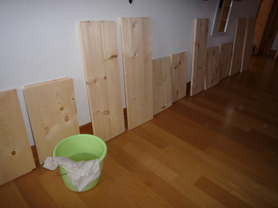 ![]() | 前板5枚をウレタンニスで塗装。寒いので、塗料が固くて塗りにくかったです。 |