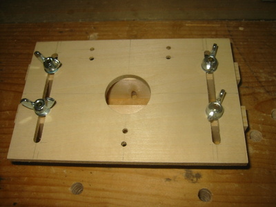![]() | この治具はWoodsmithの別冊ROUTER WORKSHOPに載っていました。オリジナルはプランジルーター用でしたが、手持ちのトリマーに合わせて大きさを変えて作ってみました。 |