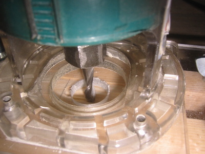 ![]() | 2007年11月14日 トリマーテーブルなしでも簡単にホゾ穴が掘れる治具を作ります。 5.5mmシナベニヤに写真の様に穴を開けます。中央はトリマービット用の穴、3角形を描いているのはトリマーを取付けるための穴(外側の穴は失敗作です(汗))、左右の長穴は6mmのボルトを通す穴です。 |