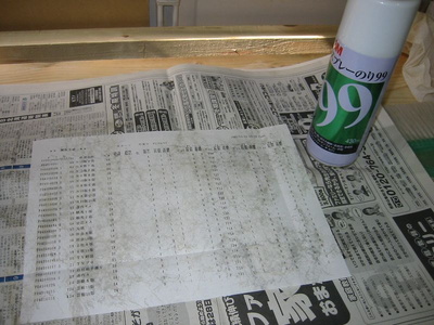 | 裏にスプレーのりを吹き付けます。全体に吹き付けて、手を付けてもべたつかないようになるまで、十分に乾燥させます。十分に乾燥させるのがポイント。乾燥が不十分だと、板からはがした時に汚くなります。 板にはスプレーのりは吹き付けません。これがもうひとつのポイントです。 |