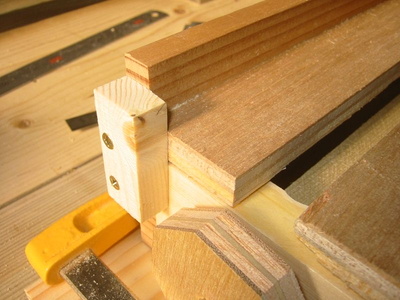 ![]() | 端にはトリマーのストッパーを付けて、治具を削らないようにしました。 |
