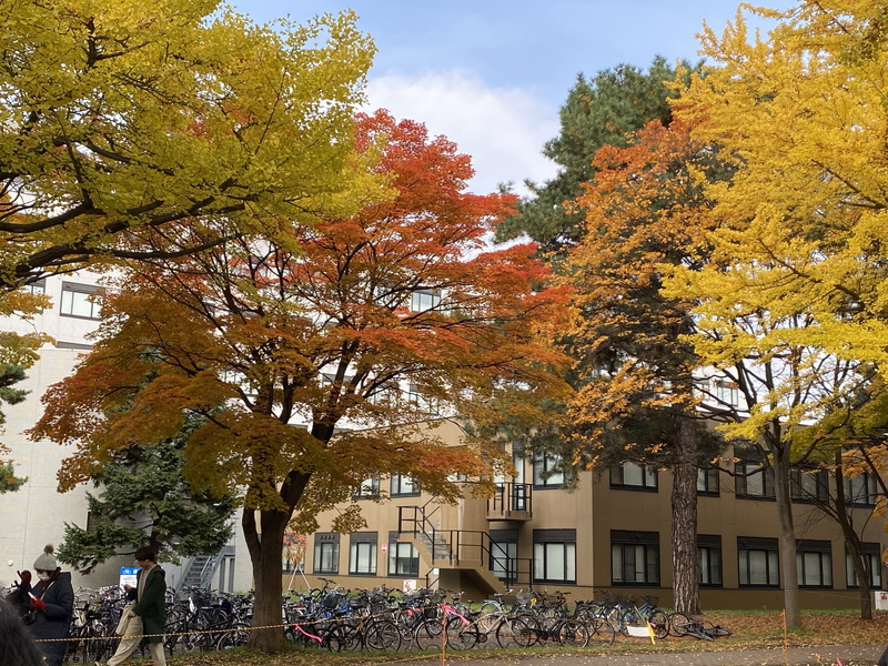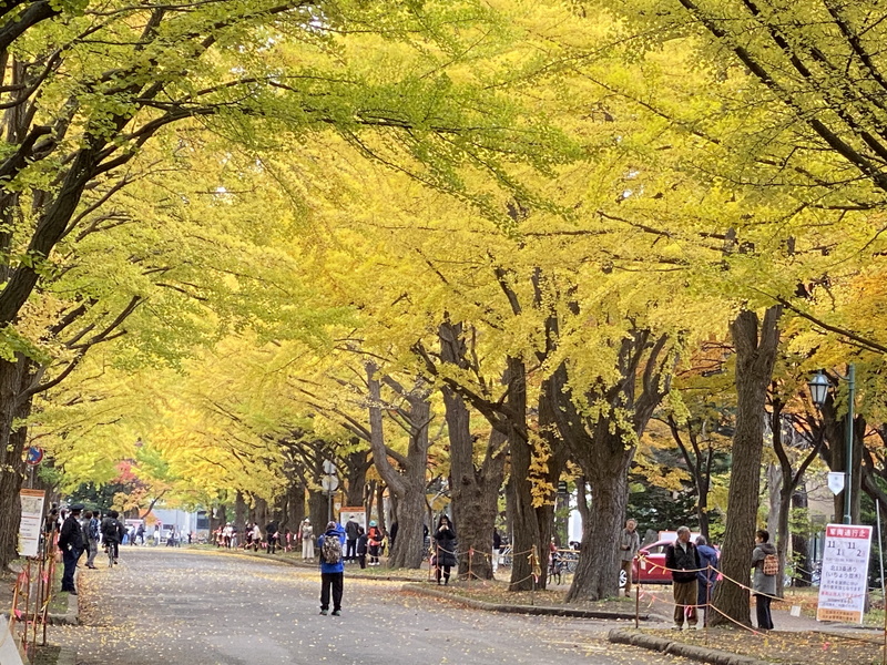 北大のイチョウ並木を見てきました。 今年は暑さが続いたので黄葉は少し遅め。 それでもかなり色付いて来ていました。 もみじの赤とまだ少し青みが残った葉が交じってきれいでしたよ。 写真クリックで大きくなります。 |