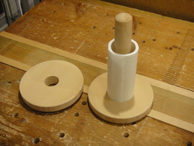 | 6mm厚の端材で芯に差し込む円盤も作り、ボンドで止めます。 釘を差し込みセンターを合わせました。 |