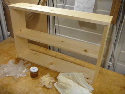 ![]() | 2014年6月12日 オスモのノーマルクリアで塗装をしました。 ウエスで刷り込み、しばらく置いてから余分な塗料をきれいなウエスでしっかりと拭き取ります。 あとは背板をつければ完成なのですが、今日はあいにくの雨。三六判は屋外でしか切断できないので、後日にします。 |