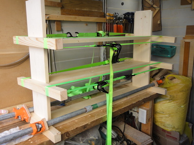 ![]() | 締め付け中。 今回は段取り良く出来ました。 当て板を使うとしっかりと締め付けることが出来ますね。でも、荷締めベルトが4本しかないので、ポニークランプと合わせ、棚板3段が精一杯。これ以上だと違う方法を考えないといけませんね。 |